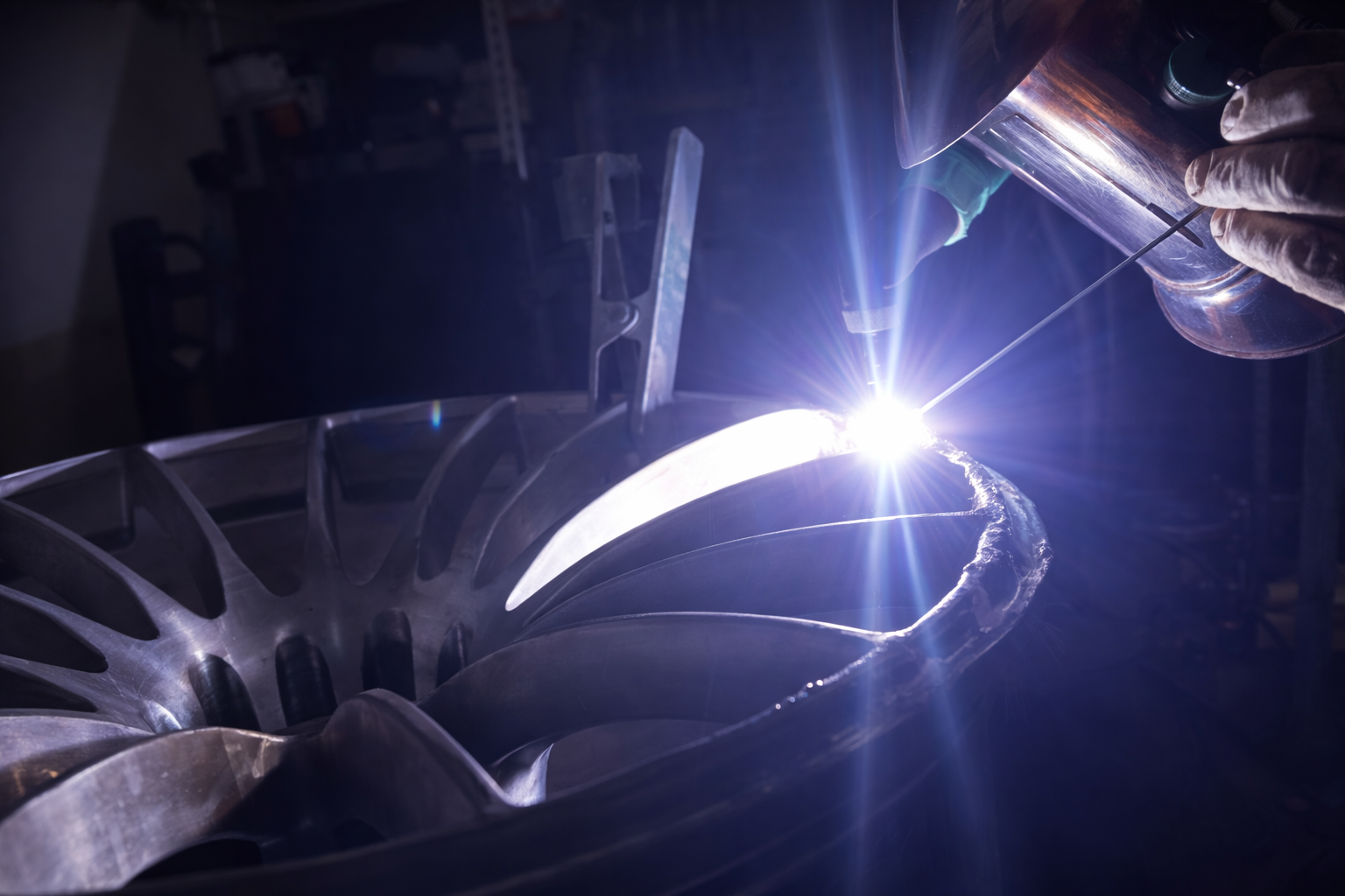 Ein spezialisierter Techniker führt die professionelle Reparatur von Kratzern und Beschädigungen an Aluminium-Felgen durch präzises Schweissen durch. Mit modernen Geräten und fortschrittlicher Technik wird
